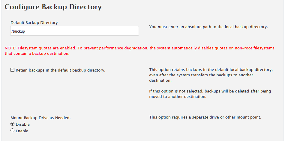 Default Backup Directory. Set to /backup/ by default, you can change it by entering the absolute path to your preferred directory location. Retain backups in the default backup directory. If selected, keeps a copy of the backup in the backup directory even after transferring the backup to another destination. If not selected, the copy will be deleted after the transfer. Mount Backup Drive as Needed. Select the Enable button to mount a backup drive. The server will check /etc/fstab/em> for another mount point. If disabled (default) the server will not check. - Set up your Additional Destinations if desired, each destination has its own setup configuration. Options are Amazon S3, FTP, Google Drive, Additional Local Directory, Rsync, SFTP, WebDAV, and Custom.